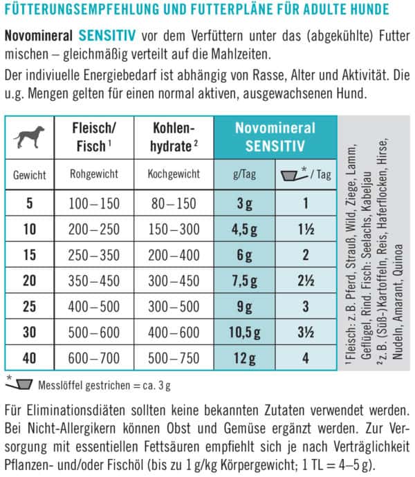Nutzen Sie unseren kostenlosen Koch-Rechner auf “futter-rechner.de” für die individuelle Dosierung von “Novomineral SENSITIV” basierend auf dem Körpergewicht Ihres Hundes. Zusätzlich können Sie dort verschiedene Kochrationen selbst erstellen und erhalten hilfreiche Tipps zu Zutaten und Zubereitung.