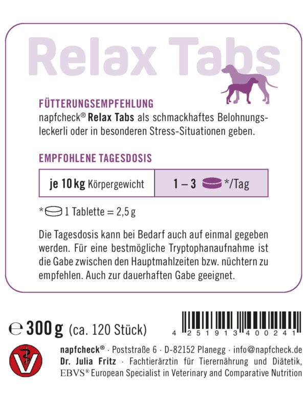 Fütterungsempfehlung: napfcheck Relax Tabs als schmackhaftes Belohnungsleckerli oder unterstützend in besonderen Stress-Situationen geben.