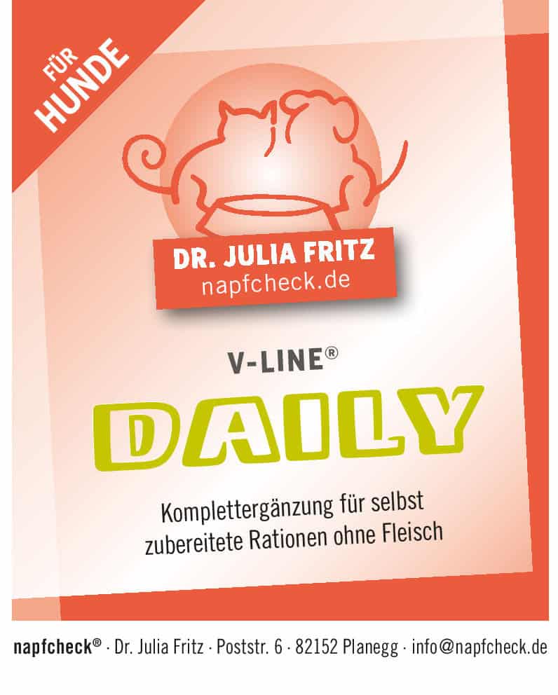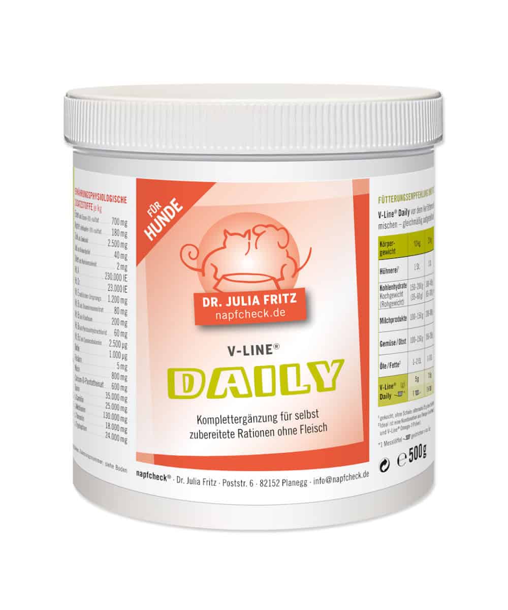 - V-Line Daily ist eine wissenschaftlich fundierte und sichere Ergänzung für eine pflanzenbasierte Fütterung von Hunden.