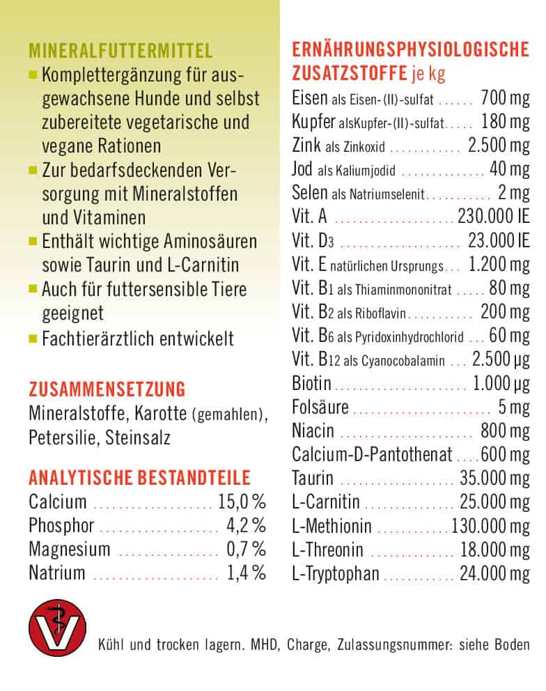 Das V-Line Daily wurde konzipiert, um genau dieses Ungleichgewicht sicher auszubalancieren. Im Gegensatz zu der Novomineral-Serie sind im V-Line Daily wichtige sogenannte erstlimitierende Aminosäuren enthalten sowie Nährstoffe, die ausschließlich oder besonders reichlich in tierischen Zutaten vorkommen (Taurin, L-Carnitin, Vitamin A, D3 und B12). Eine weitere Besonderheit sind die speziellen Gehalte an Spurenelementen, die nicht nur auf Grundlage der reinen Bedarfsdeckung und typischen Schwankungen in den Nährstoffgehalten der Rationskomponenten – wie bei klassischen Mineralfuttern – bestimmt wurden, sondern eben auch die für den Hund mindere Bioverfügbarkeit der Spurenelemente aus pflanzlichen Futtermitteln im Vergleich zu tierischen Futtermitteln berücksichtigt.