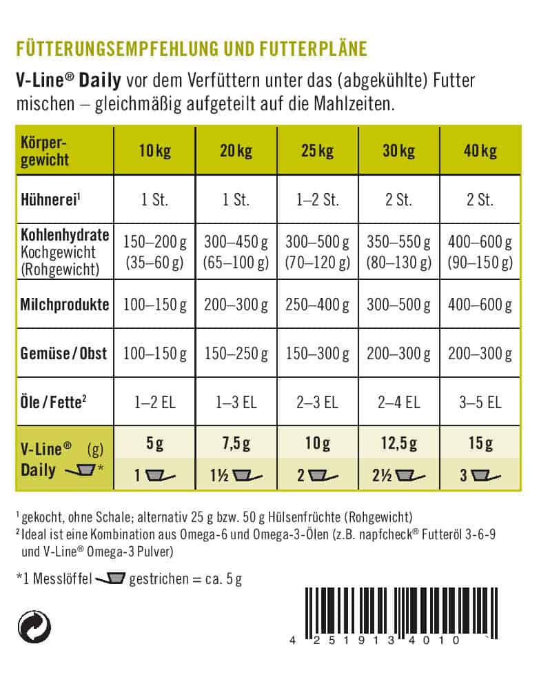 V-Line DAILY einfach unter das tägliche Futter mischen, gleichmäßig verteilt auf die einzelnen Mahlzeiten.